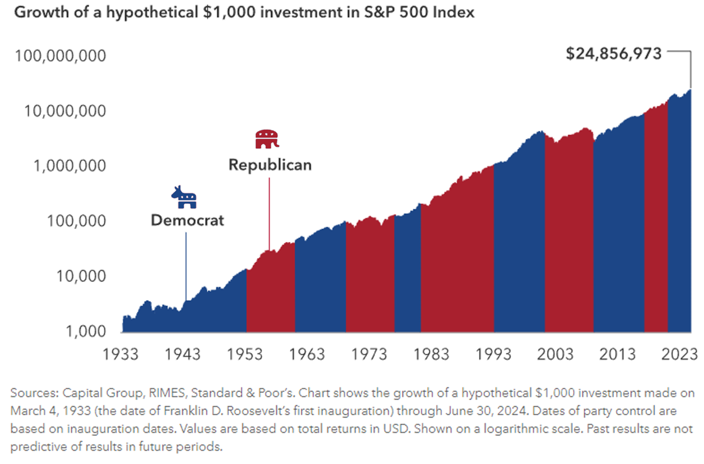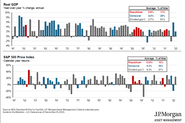 Now, all of this may sound like the election result will have a major impact on our day-to-day lives and the U.S. economy, potentially creating ups and downs in the stock and bond markets. We might think there are things to worry about that could lead to big changes in how we manage our investments in response to the potential political risk. But will it really have such a big impact? And do we need to change our investment strategies?